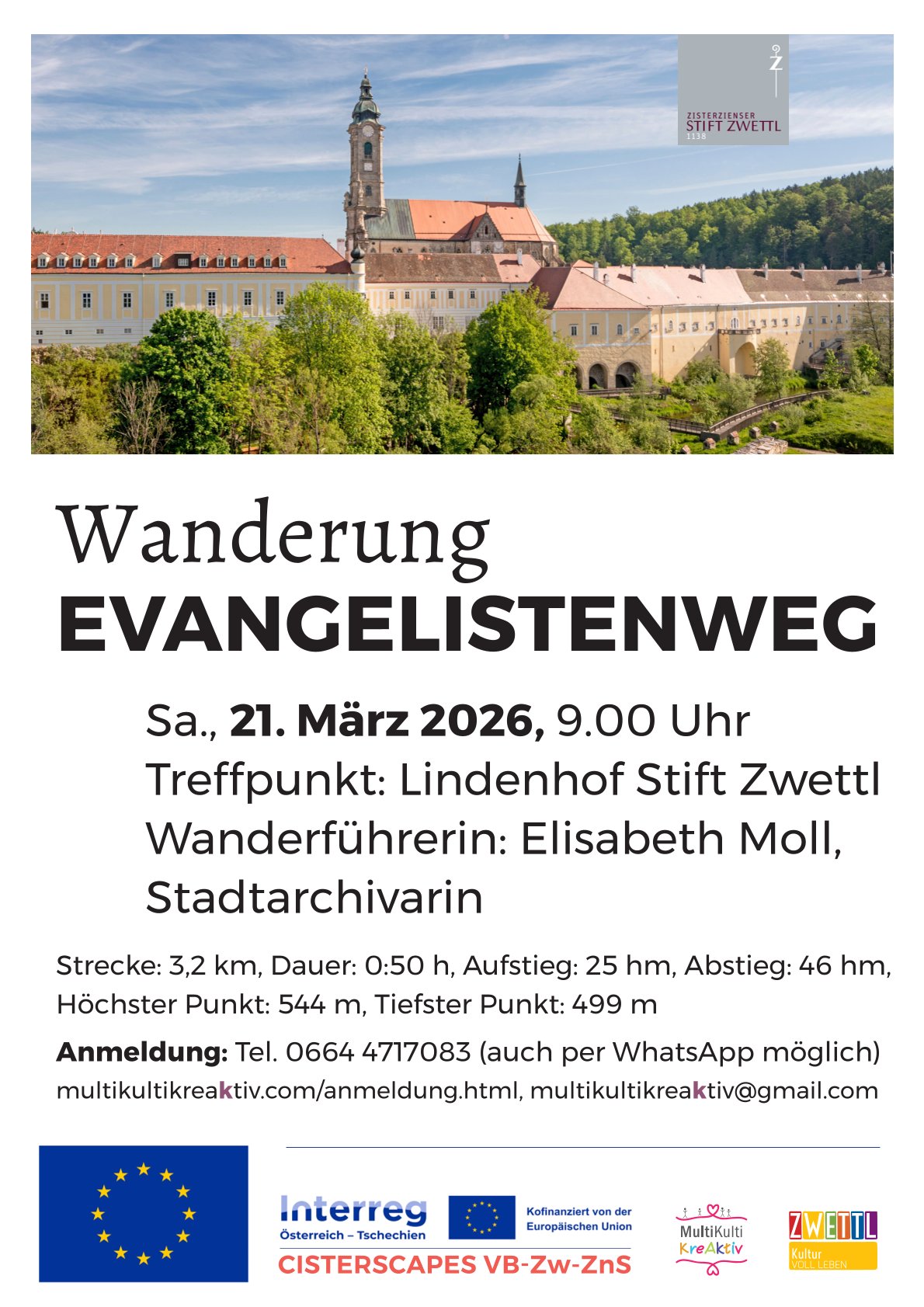 Gemeinsam mit dem Verein MultiKulti KreAktiv organisieren wir im Zuge des Projektes CISTERSCAPES VB-Zw-ZnS, ATCZ00007 geführte Wanderungen. Wir freuen uns auf alle interessierten Menschen, die mit uns gemeinsam die naheliegenden Klosterlandschaften entdecken möchten.